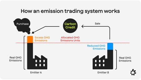 ETS establishes an emission cap and allocates allowances to companies. Those exceeding their quota must purchase additional credits, while those reducing emissions can sell their surplus.