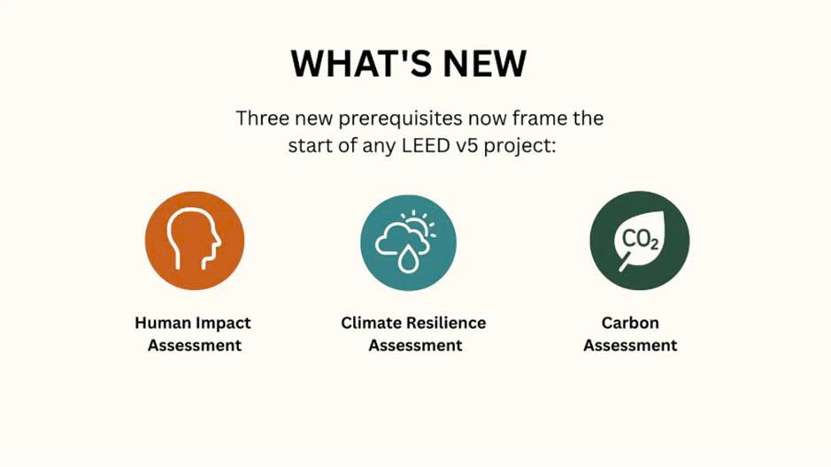 LEED v5 requires a 25-year life-cycle carbon assessment, including energy, refrigerants, embodied carbon, and transportation.