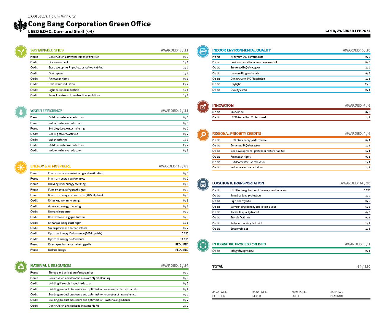 Hình 2 Bảng điểm LEED của Văn phòng Công ty Công Bằng. Nguồn: USGBC