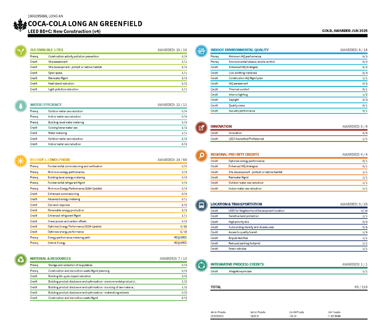Hình 4 Bảng điểm LEED của Nhà máy Coca-Cola Tây Ninh. Nguồn: USGBC